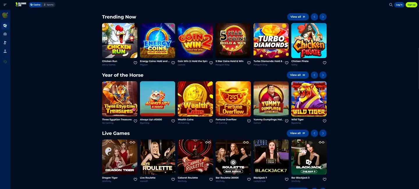 V BillionaireSpin app najdete več kot 2000 iger vrhunskih ponudnikov, vključno z igralnimi avtomati, blackjackom, ruleto in video pokerjem. Na voljo so tudi igre z živimi krupijerji za pristno kasinsko vzdušje. Vse igre so optimizirane za igranje na mobilnih napravah z brezhibno grafiko.